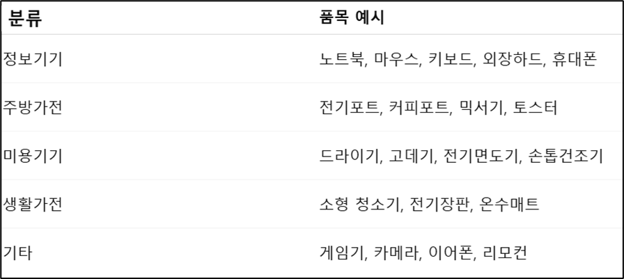 예시: 드라이기, 고데기, 노트북, 전기포트, 디지털카메라, 전기장판 등