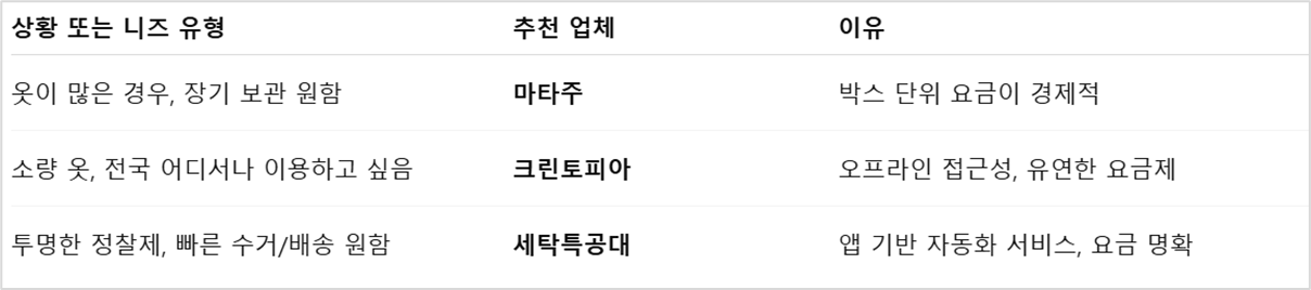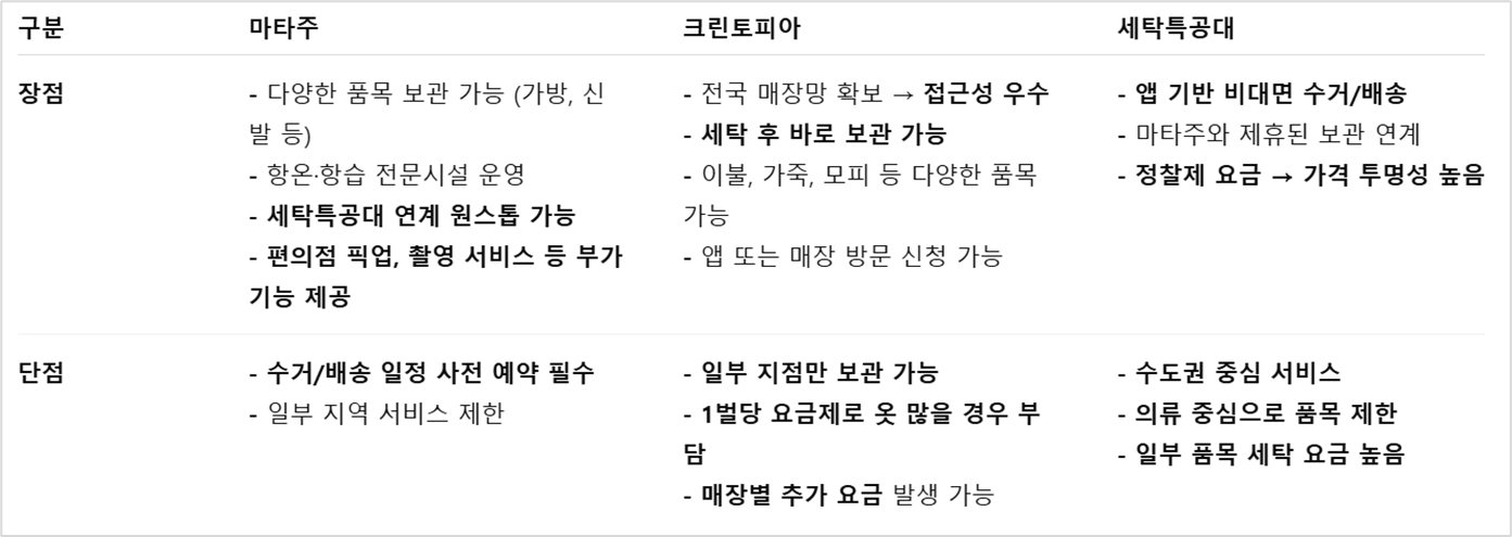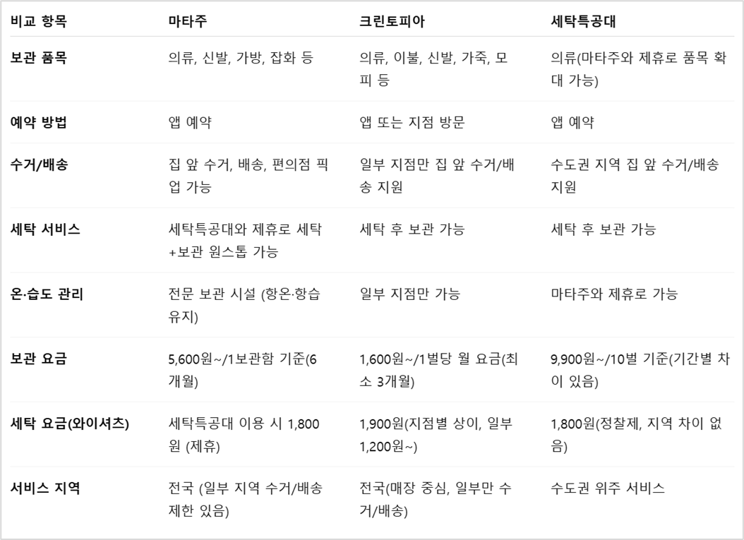 아래 표는 2025년 기준으로 가장 많이 사용되는 3대 옷보관서비스의 기능, 가격, 세탁 연계 여부 등을 한눈에 비교한 것입니다.