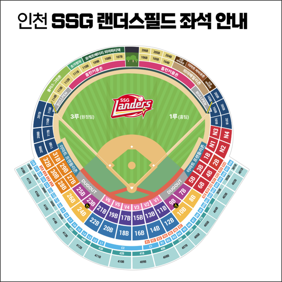 좌석은 경기장 구조상 크게 내야, 외야, 응원석으로 구분됩니다.