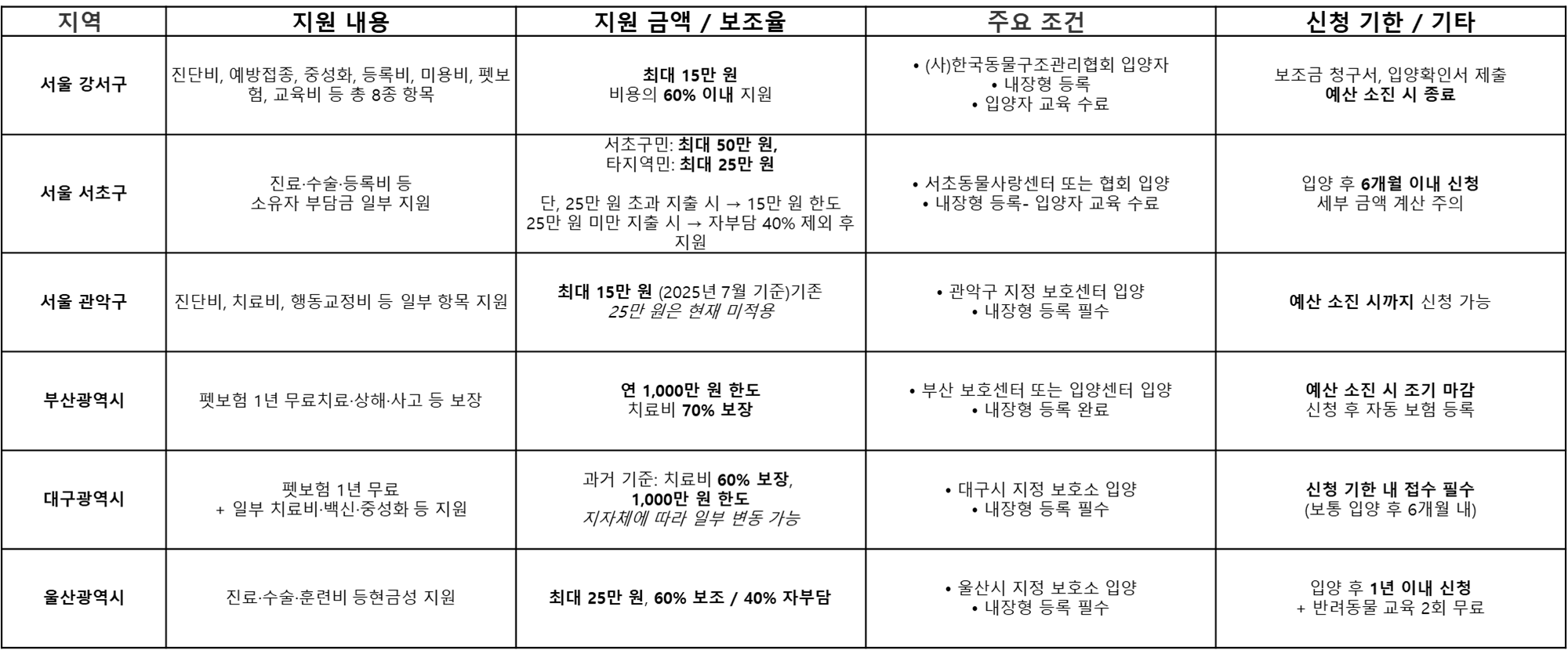 3. 유기견 입양 시 받을 수 있는 기본 지원금 상세 (서울·부산·대구·울산)