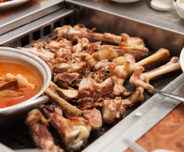 옛날 짚불구이 방식에서 영감을 받은 닭구이는 은은한 불향과 고소한 맛이 특징입니다.