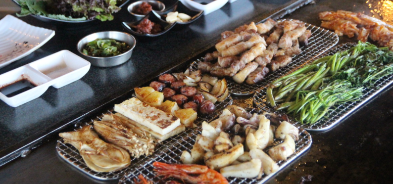 삼겹살, 새우, 갑오징어, 소시지 등 다양한 구성이 한 번에 나오는데,
