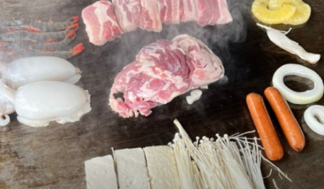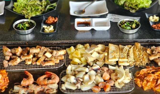 불꽃 튀는 철판 위에서 구워지는 삼겹살, 그리고 새우, 갑오징어까지 함께 구워 먹는 재미가 쏠쏠해요.