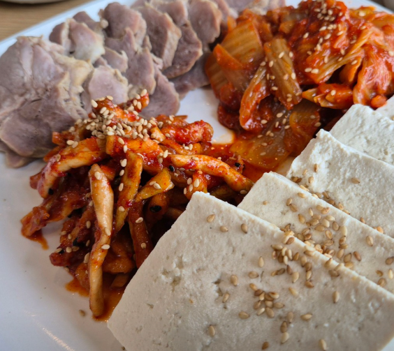 두툼하게 썰어낸 손두부와 잘 익은 보쌈김치가 어우러져