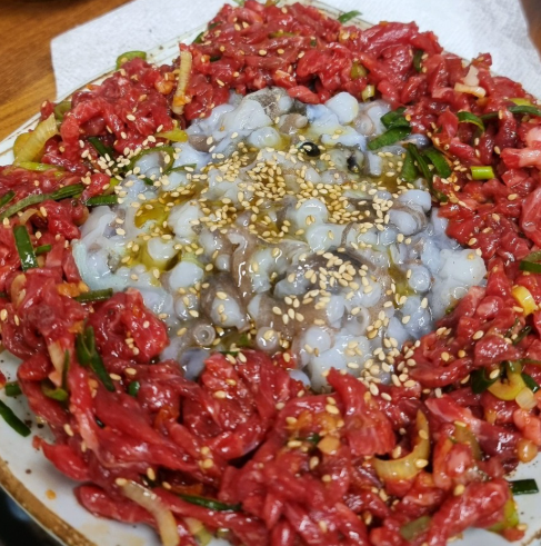 한우만으로도 충분하지만, 여기에 낙지탕탕이까지 곁들이면 금상첨화.