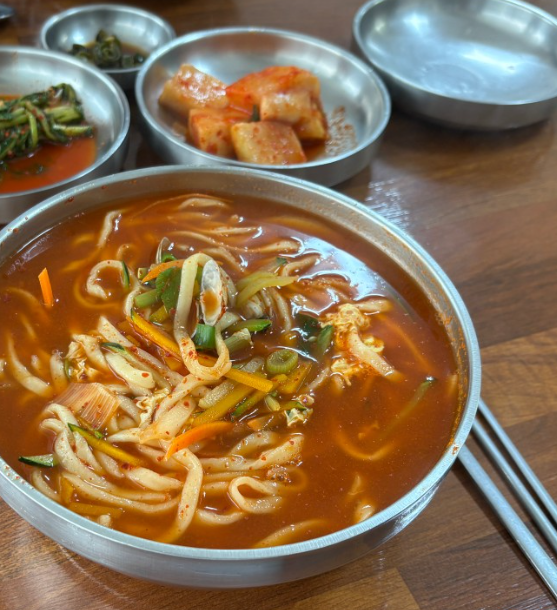 바지락 베이스의 시원한 육수에 고춧가루가 적당히 들어가자극적이지 않으면서도 중독성 있는 국물이 매력적이에요.