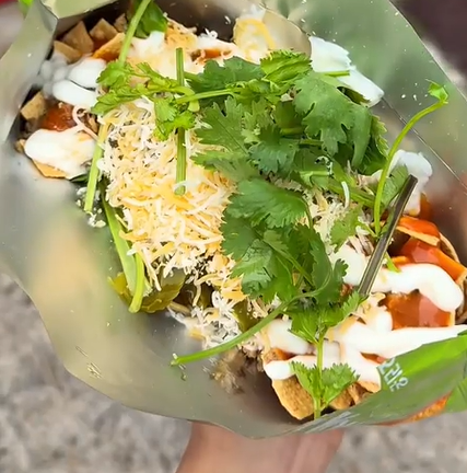 도리토스나 콘칩 봉지째 가져가면, 그 위에 고기, 사워크림, 살사, 치즈까지 쭉쭉 얹어주는 방식이죠.