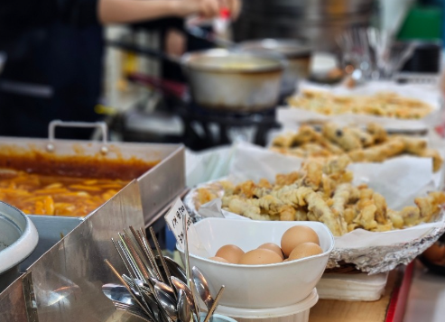 가게 안에서 튀김 기름 소리 들으며 한 입,매콤한 국물에 김밥 한 점 적셔 먹는 그 순간,