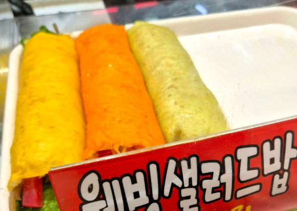 얇은 밥 위에 빽빽하게 채운 속재료들.특히 웰빙샐러드김밥은