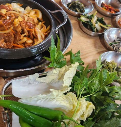 돌솥에 지은 고슬한 밥과 불맛 가득한 고추장불고기, 그리고 신선한 쌈채소까지.