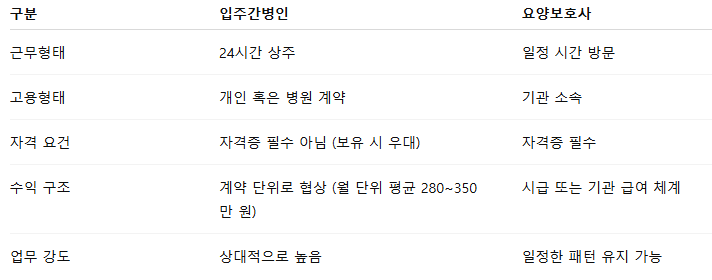 다음 표는 입주간병인과 요양보호사의 주요 차이점을 비교한 것입니다.