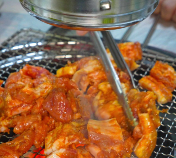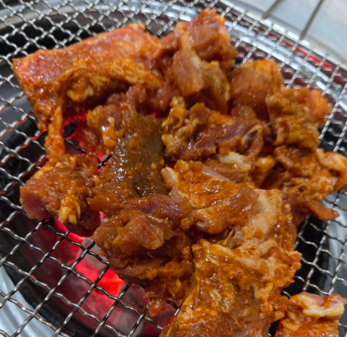고추장 양념에 제대로 절여진 돼지갈비와 삼겹살, 그리고 숯불에 직접 구워 먹는 재미까지!