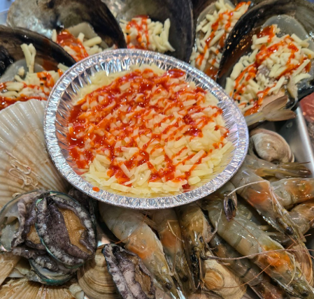함께 나오는 콘치즈, 버터, 라면 사리도 조개와 찰떡궁합이에요.
