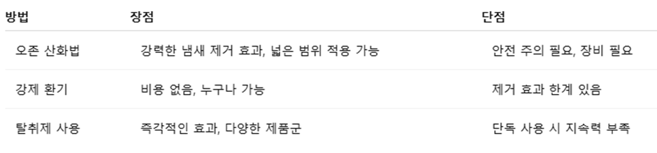 단일 방법보다는 상호보완적인 방식으로 접근해야 장기적인 냄새 제거에 성공할 수 있습니다.